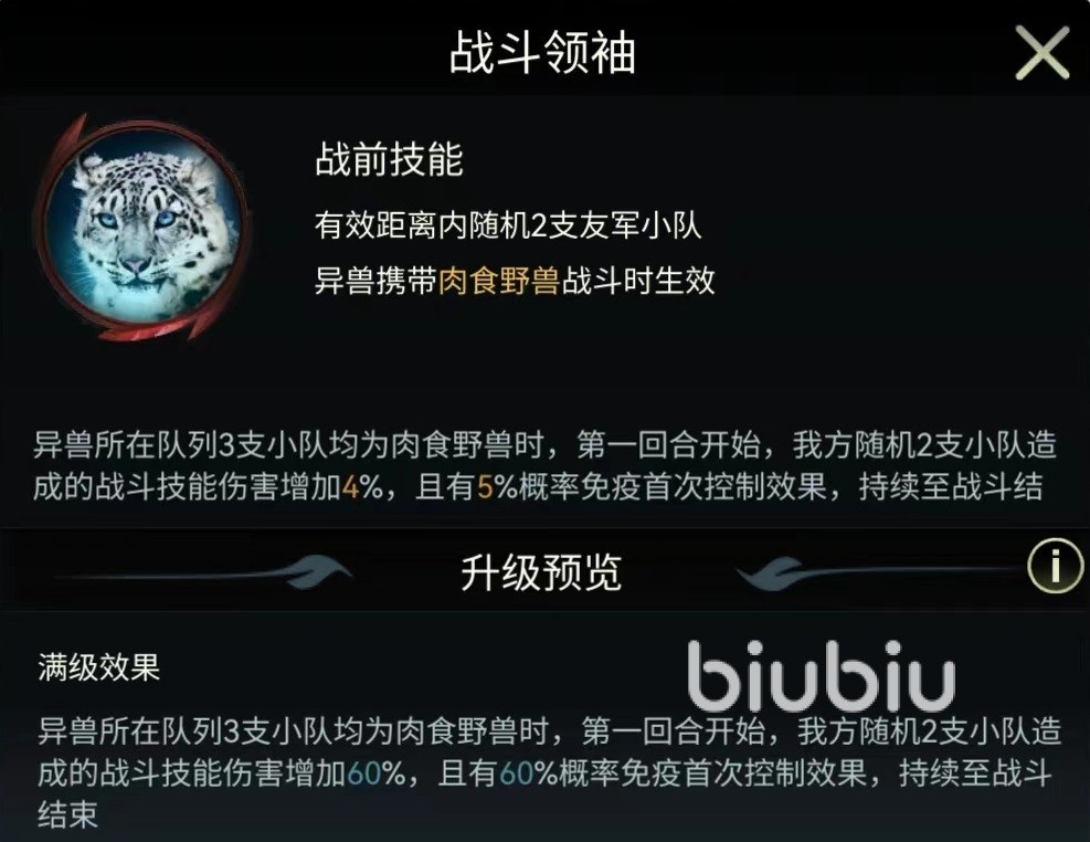 最后一个战斗领袖,只有当所在队列三只小队都是肉食野兽时才能生效,在第一回合为随机两支小队提升战斗技能伤害,有60%几率免疫首次控制,效果一直能持续到战斗结束。至于其他的通用技能,在所提升的属性方面和其他橙色异兽相差无几,所以无需再过多介绍,这四个独有技能所带来的提升是全方位的,尤其是在防御方面更是有着极好的表现。
