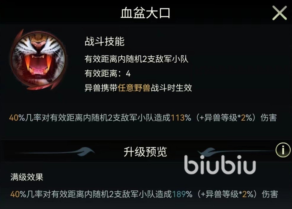 作为一名顶级的异兽,西伯利亚虎具有三个战斗技能,分别是血盆大口、迅猛突击和凶猛爪击,每一个技能都非常犀利。血盆大口技能在达到满级时有百分之四十几率随机选择两个敌方目标造成伤害,该技能有效距离为四格,所以西伯利亚虎也可以放到中排或是后排,同样不影响战斗技能的输出。