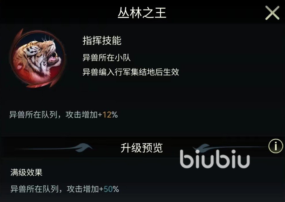 除了伤害技能方面非常犀利之外,其他增益类技能也很突出。三级统统治力和其他的异兽相同,这里不再介绍。自己所携带的高级攻击和高级防御,可以分别提升55%防御以及攻击属性,这点方面并不属于很出色的一类。但自身还有丛林之王这一项特殊技能,使其所在队列攻击力增加50%。这就属于非常顶级的增益类技能,让整个小队输出都能大幅度提升。西伯利亚虎的群落领袖技能,可以大幅度增加所在小队的攻击、防御以及普攻伤害。