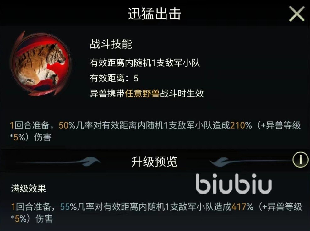 凶猛爪击有效距离更远,五格,满级有80%几率随机选择两个敌方目标造成伤害,该技能虽然在伤害数值方面比血盆大口要低一些,但是发动机率高,而且生效距离远。迅猛突击要一回合准备后释放,55%几率随机选择一个敌方目标造成一次高额伤害。单从伤害数值来看,该技能是最高的,但只能选择一个目标,如果能够伤害到敌方后排,那么给对方绝对是沉重的打击。