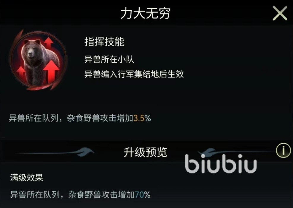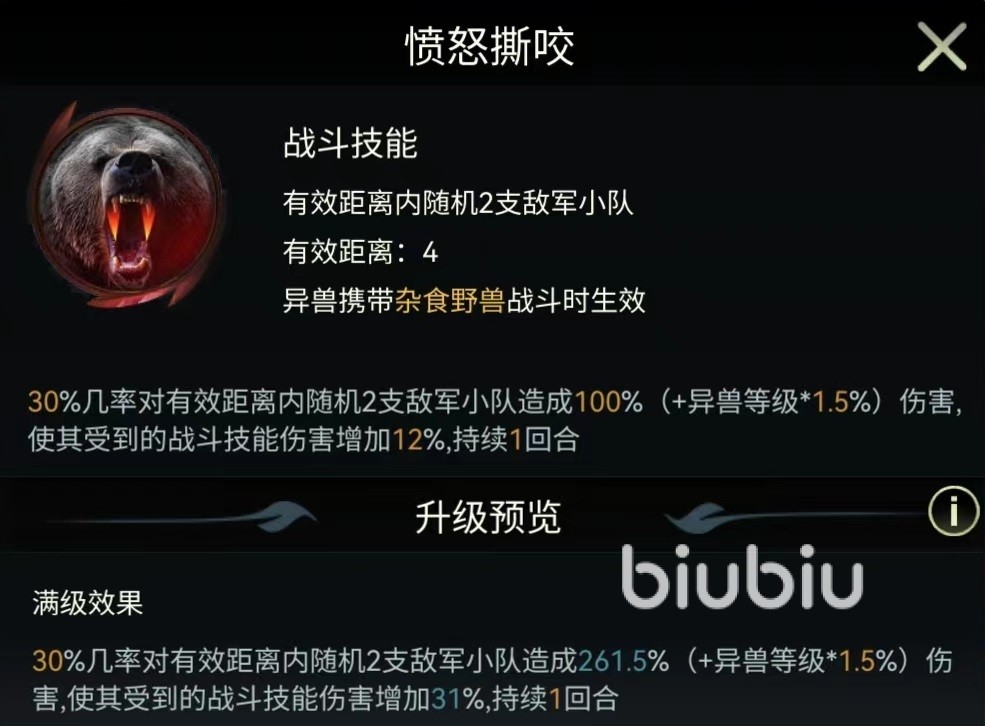 它还拥有三个自身专属的战斗技能,分别是愤怒撕咬、野兽威慑和狂乱拍打。愤怒撕咬有效攻击距离为4格,需要携带杂食性野兽战斗才能生效。在达到满级时有百分之三十几率随机选择两支敌方小队造成伤害,并使其接下来受到的战斗技能伤害增加31%,持续一回合。这也就意味着在该技能使用之后,后续可以直接集火。野兽威慑不属于伤害类型,而是一种状态,在战斗开始的前四回合,敌方随机两支小队造成的战斗技能伤害降低,满级时可以削弱35%的伤害值,这就限制了对方战斗输出,也是美洲黑熊很独特的一点。
