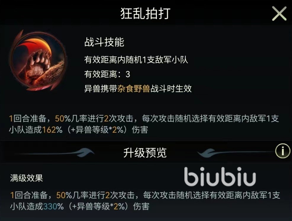 狂乱拍打的有效距离为三格,需要一回合准备时间,达到满级时有百分之五十几率进行两次攻击,每次都会选随机选择一个目标造成海量伤害。如果两次全都打在同一个目标身上,对方将会非常难受。