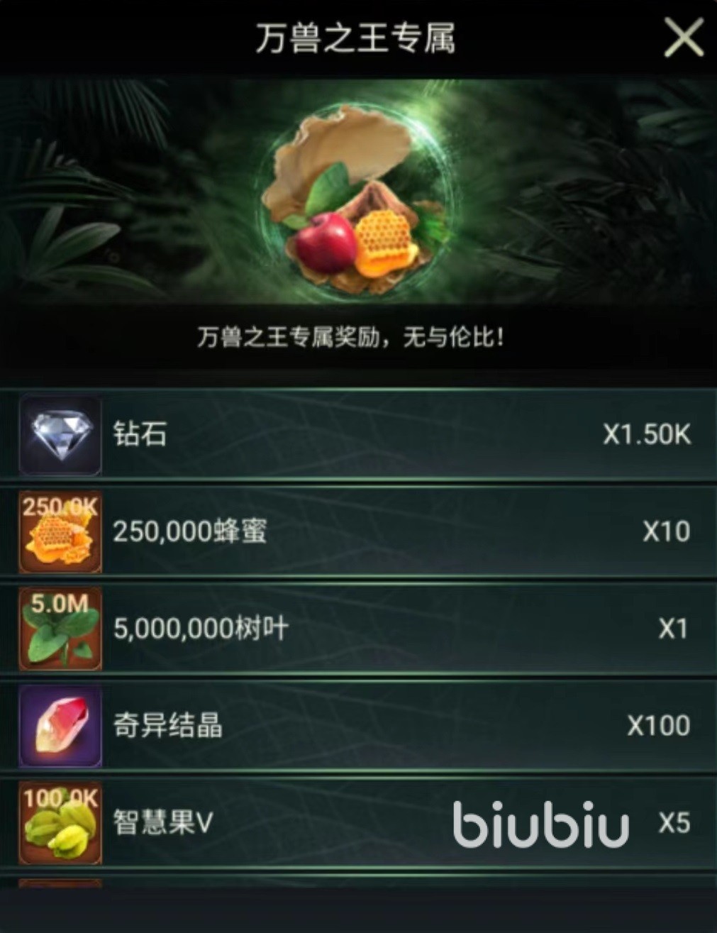 在成为兽王之后将会获得专属奖励,大量钻石和资源,对领地有着很大帮助。另外特权是可以惩罚或任命本区域内的领主,拥有相应奖励职位和惩罚职位,提供属性加成以及降低属性。例如有些职位可以增加进化速度,野兽攻击力,资源产量等,还有可能降低对方行军速度和攻击力。总之就是兽王可以奖励伙伴惩罚敌人,真正享受到一呼百应的王者风范。