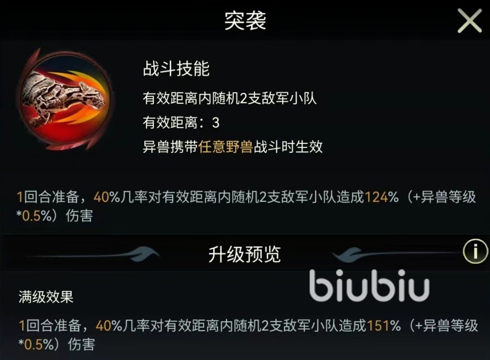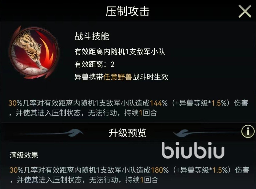 结合这样的技能效果,云豹可以和其他具有压制的异兽一起组成队伍,这样可以对对方造成持续限制。伤害方面中规中矩,有了压制效果就比较适合选择。
