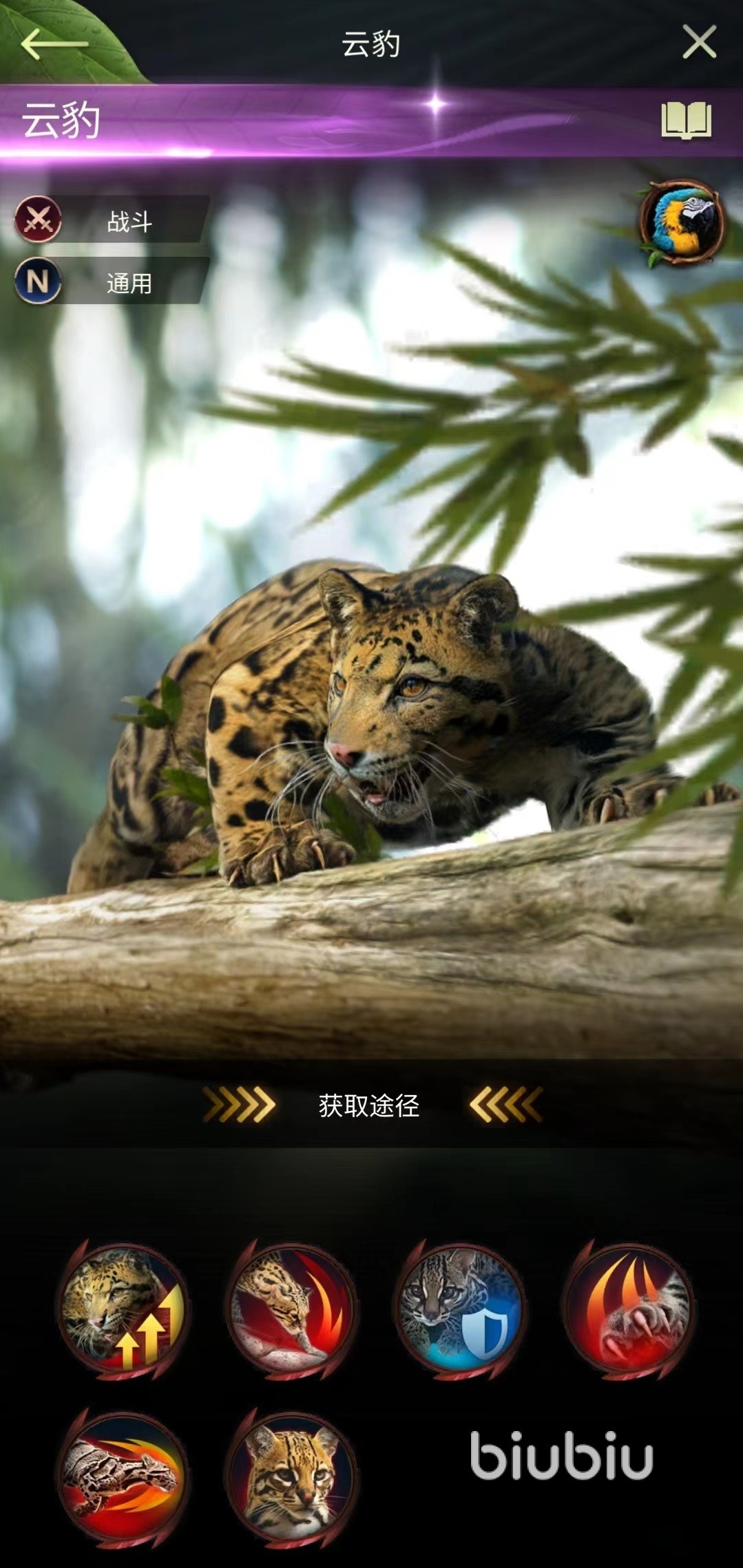 云豹属于战斗类型的通用异兽,自身擅长近距离格斗,在前排或中排小队可以发挥出技能特点。作为猫科动物,云豹在亚洲东南部有广泛分布,四肢粗短而矫健,尾巴非常长与身体相当。在猫科动物中,云豹的犬齿与身体比例是最大的,这使它可以狩猎很多大型动物。