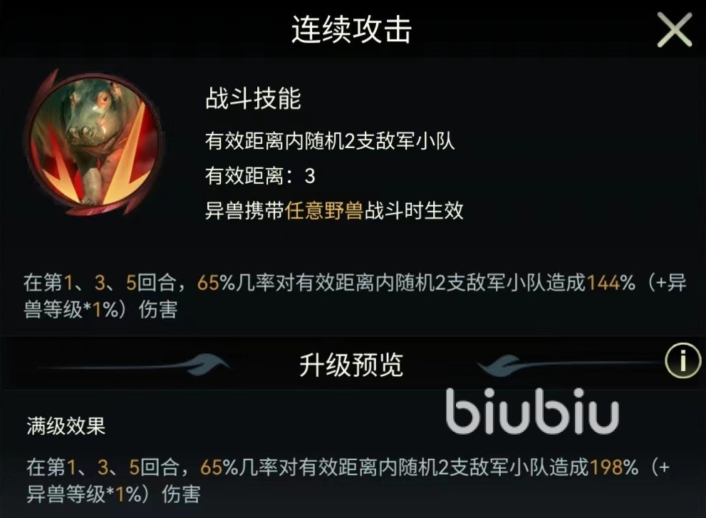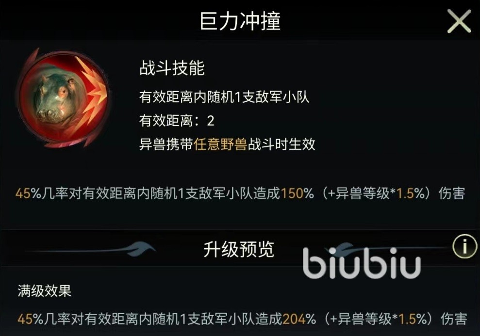 在战斗方面主要有巨力冲撞和连续攻击这两个技能,其他类型都是为小队其他野兽进行加成,包括中级防御、中级攻击等。毕竟属于紫色品质,所以加成类技能带来的属性提升非常少,中级防御和中级攻击只能带来10%防御和攻击加成,这还是达到满级时的效果,这也限制了在后期发挥,无法成为长期使用的异兽。巨力冲撞有两格有效距离,45%几率随机对一个敌方目标造成伤害。连续攻击有三格有效距离,在战斗开始的第1、3、5回合生效,有65%的几率随机伤害两名敌方目标。