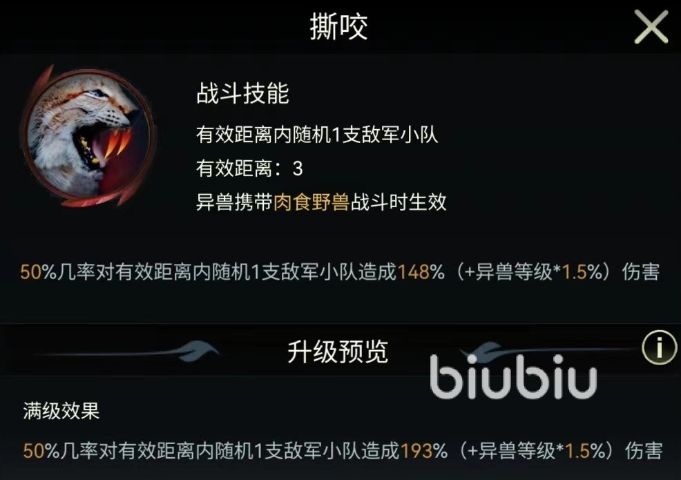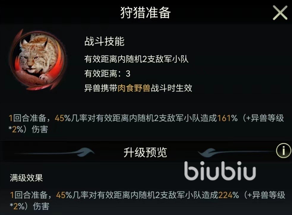 今天介绍的猞猁属于远程战斗类型,适合在中排和后排发挥优势,自身属于肉食野兽,率领肉食野兽类兵种可以发挥出最大特点。在战斗方面,两个主要伤害技能是撕咬和狩猎准备。其中撕咬的有效距离三格,需要肉食野兽才能够生效,有百分之五十几率伤害随机一个目标。当达到满级时伤害比例为193%。狩猎准备的有效距离也是三格,需要一回合准备,有45%几率对两个目标发动攻击,达到满级时的伤害比例为224%。