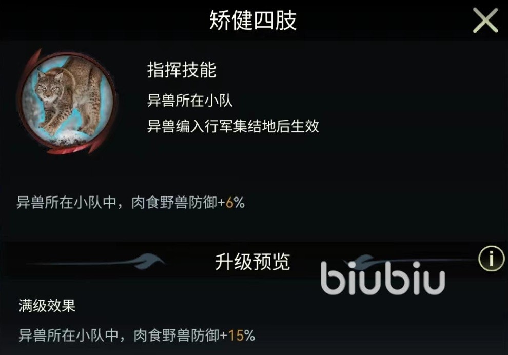 从伤害来看,在同品质中属于比较高的类型,没有其他附加效果,并不能对敌方造成限制,是单纯伤害输出。作为首领,当然需要给小队成员带来各种加成。相关技能分别是矫健四肢,尖牙利爪和群落领袖。矫健四肢能够增加肉食野兽15%防御,尖牙利爪可以提升肉食野兽15%攻击,这两项也是紫色常规技能,群落领袖增加10%攻击和5%防御。