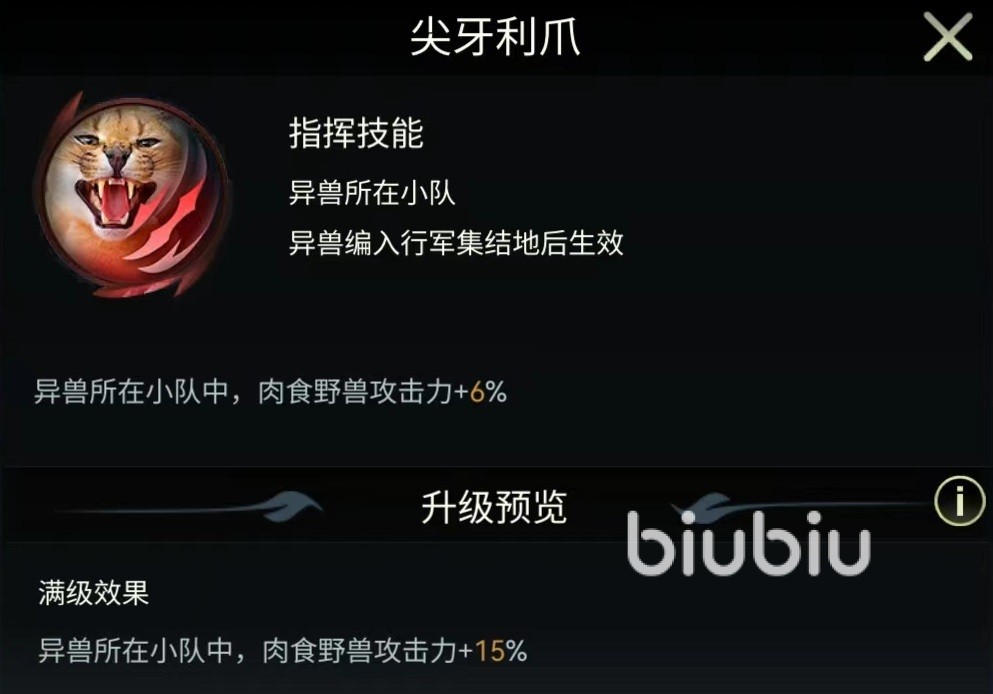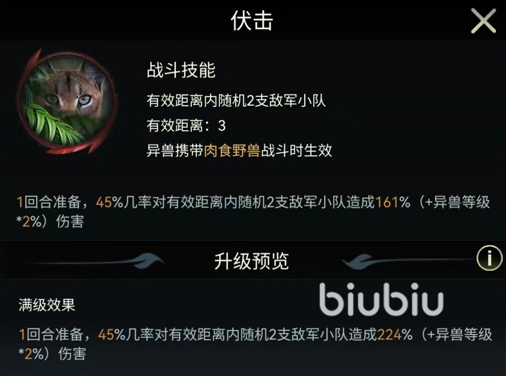当携带的是肉食野兽时,这些技能就可以生效了。矫健四肢能够增加肉食野兽防御力,达到满级时增幅为15%,尖牙利爪提升的是肉食野兽攻击力,满级时同样为15%。群落领袖提高小队所有野兽10%攻击力和5%防御,从防御攻击属性增幅来看中规中矩。另外两个伤害技能,伏击有效距离三格,需要一回合准备,然后有45%几率随机选择两个敌方目标造成伤害。巨力撕咬有效距离为三格,40%几率对于有效距离内随机一个目标造成伤害,输出之后会将对方虚弱,使其造成的伤害降低10%,持续一回合。