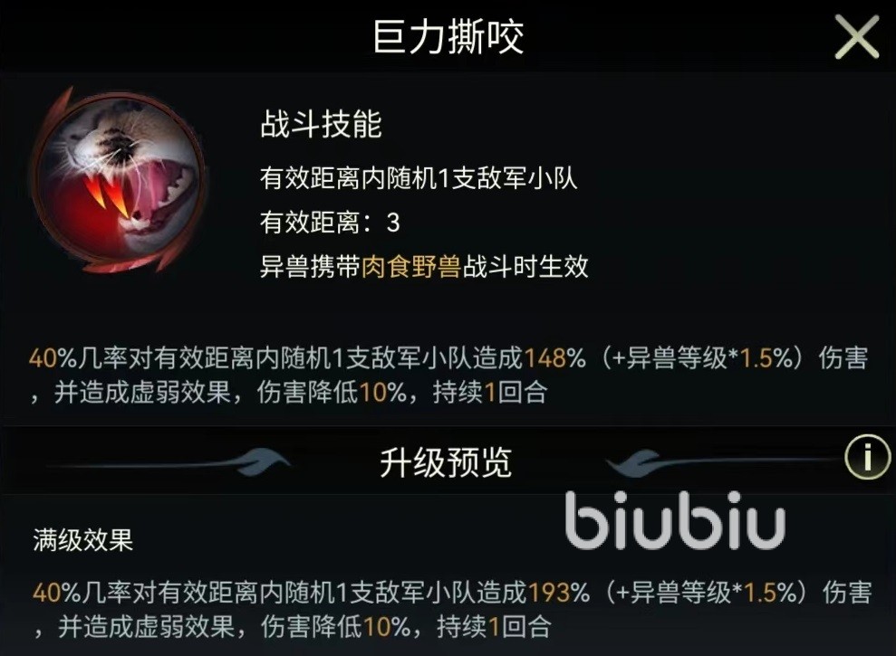 从技能伤害来看还是非常出色的,当然这是相对于紫色异兽来说,带来的虚弱也可以限制对方输出,所以在前中期阶段也是队伍中不错的输出型选手。可以组成全肉食野兽的队伍,配合上其他的橙色异兽发挥打出伤害。