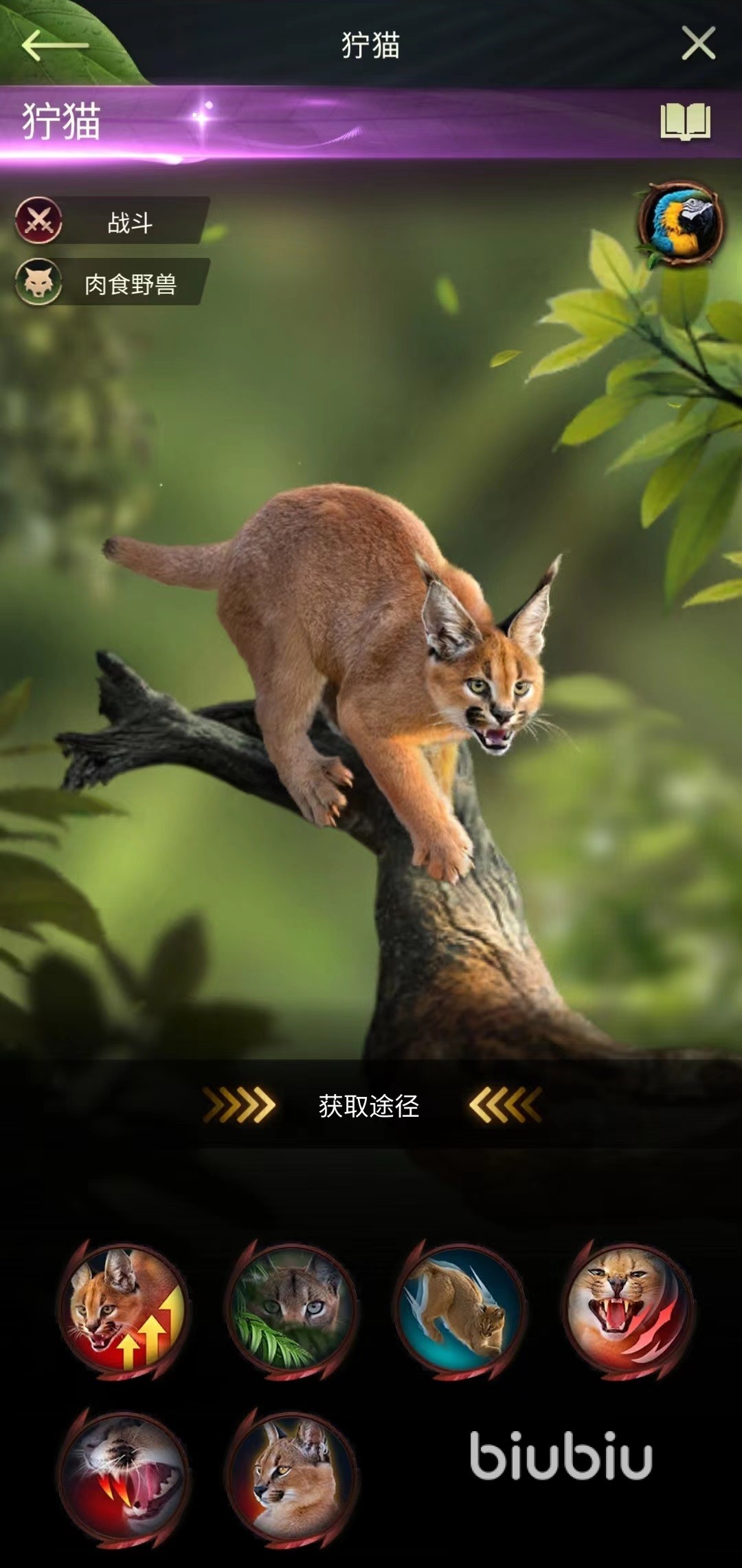 狞猫属于猫科动物,在非洲、西亚、南亚都有分布、跳跃能力极强,奔跑速度快,捕食成功率高,虽然自身体型并不大,但却是一个难缠的对手,这些特点在技能中也都有体现。作为能够率领肉食野兽的异兽,自然也少不了统治力技能,和大多数紫色异兽一样,它具有的是二级统治力。另外还有一些独有技能,包括战斗类型的伏击、巨力撕咬,以及可以给小队成员带来加成的矫健四肢、尖牙利爪和群落领袖。