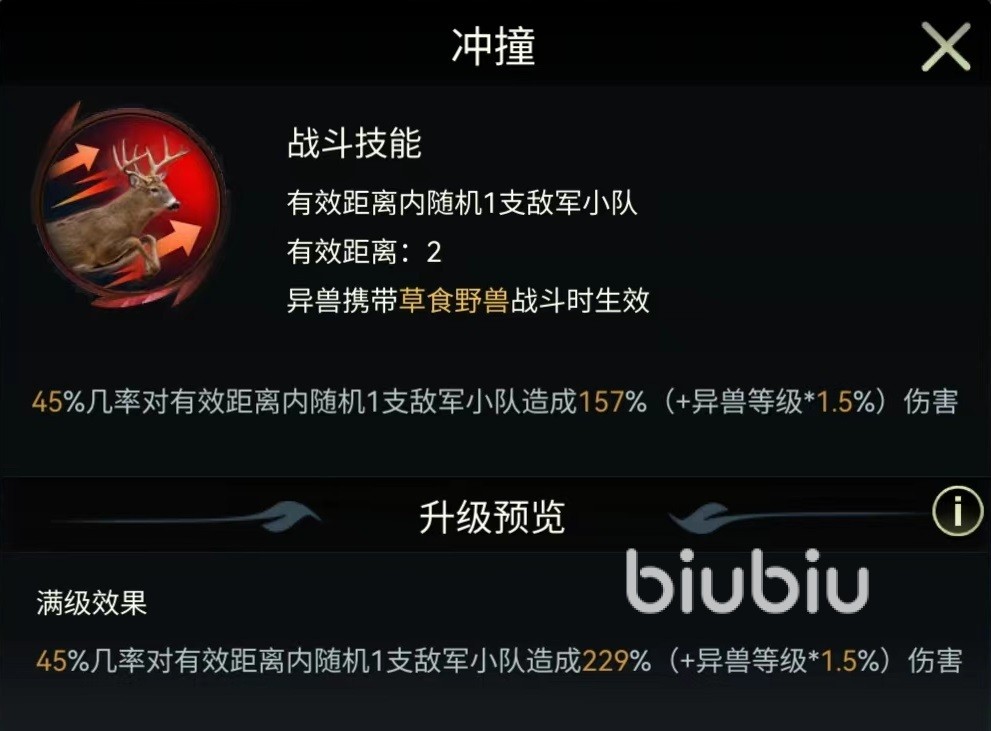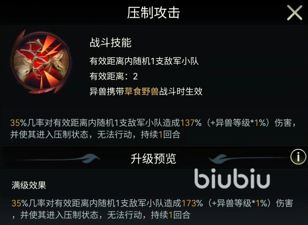 冲撞有效攻击距离为两格,在携带草食野兽战斗时才会生效,达到满级有45%几率随机选择一支敌对小队造成伤害。压制攻击也是两格有效距离,满级时有35%几率随机选择敌方目标造成伤害后,使其进入压制状态。压制之后目标无法行动,持续一回合。伤害方面尚在其次,带来的压制效果是非常有用的控制状态,一旦成功控制住目标,对方输出就会受到限制。