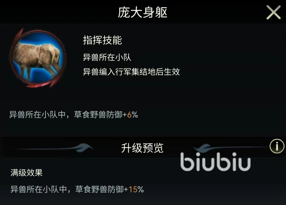 庞大身躯可以使所带小队的草食野兽防御最多增加15%。锐利犄角使所在小队食草野兽攻击力增加15%。最后的群落领袖,满级时增加10%攻击力,5%防御,还能额外提升二级统治力技能的效果。各个方面来看都属于中规中矩的紫色类型异兽,除了技能压制之外,并没有其他出色的地方,很多玩家前期也可以直接抽取过来,这样能够利用防御方面的一些优势度过前期阶段。