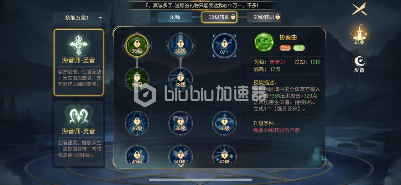 在乐师达到38级以后可以进行转职,有两个路线可以走,一个是圣音主辅助,拥有强力的回血能力,为团队提供最大的辅助作用,是各位副本中的抢手职业,但是自身没有输出,在后期不靠队友伙伴很难完成单人任务和关卡挑战。另一个是灵音,主要打控制,伤害回复,技能上面回复能力没有那么好,但是有自身一定的输出能力,可以应对大部分的副本关卡BOSS,休闲玩家比较推荐,可以靠伙伴一起挑战各类任务。