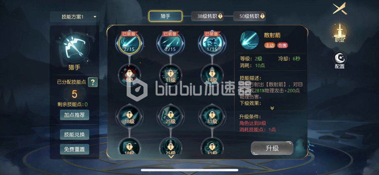 这个是猎人一开始最初的AOE技能,CD时间短,输出高,非常灵活,可以对前方射出散射箭,对目标造成281%的物理伤害,这个技能面对正前方聚拢的敌人清理起来效率非常高,是前期主要的刷副本闯关技能,玩家在升级了它的被动禁疗之后可以有效打击会回血能力的敌人,在PVP中对乐手非常克制。