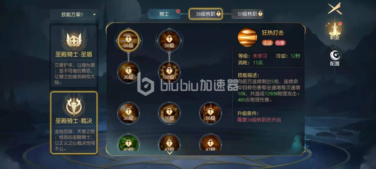 极限和蒙恩都是在骑士的血量低于25%的时候,可以增加受到的治疗效果,还有减少受到的伤害,目的都是保证在低血量的时候,有能力撑住等待治疗的加血。裁决方向其实更适合在PVP中使用,裁决主要的技能狂热打击,是一个非常强悍的输出技能,可以朝着前方打出高额的连续伤害,这个技能在对抗巫师,乐师等远程职业的之后,伤害是很可观的。