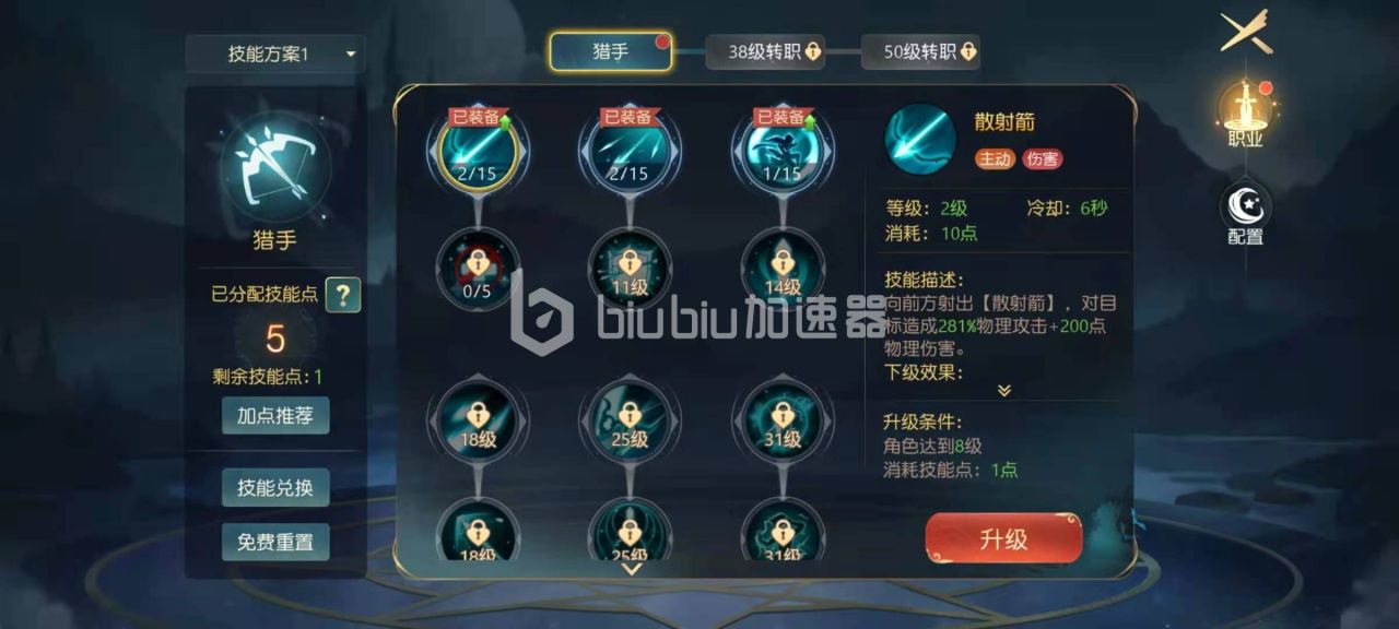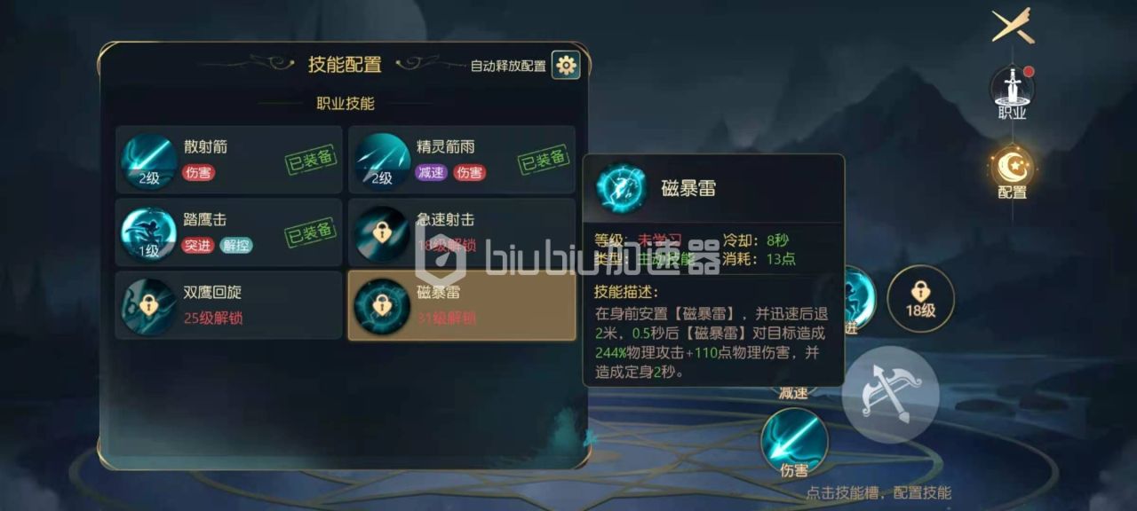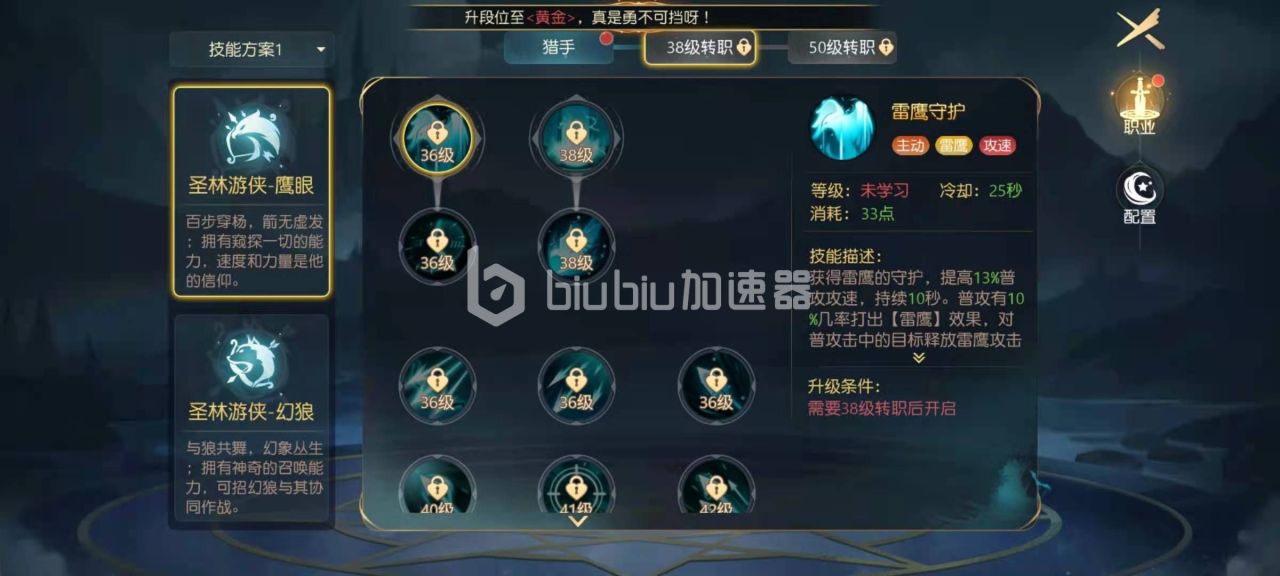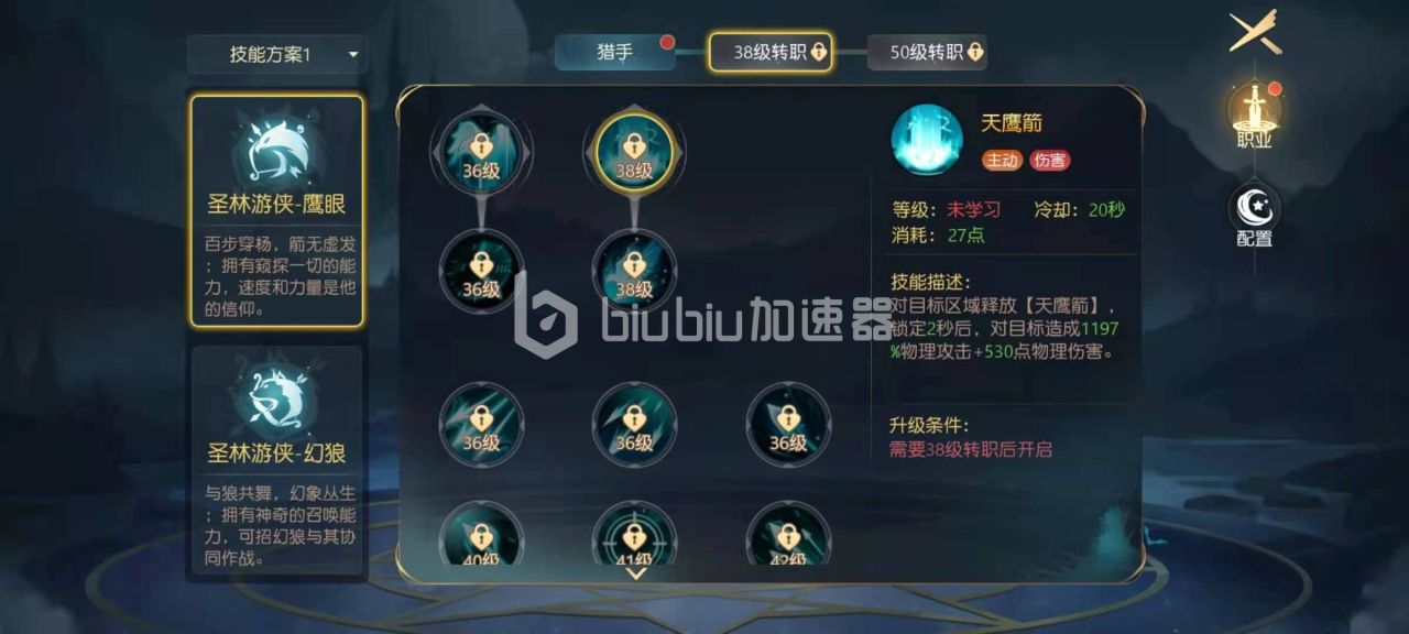 猎人转职为鹰眼之后,主要的变化是新增加了两个主动技能,雷鹰守护和天鹰箭,还有将三个转职之前的主动技能散射箭,精灵箭雨和磁暴雷进行了强化。其中雷鹰守护这个技能主要的效果是提高了攻击速度,并且在使用普攻的时候,有几率打出雷鹰效果,雷鹰可以帮助输出,造成范围伤害。应该说这个技能是个非常不错的输出技能,大家千万不要小看攻速带来的提升。