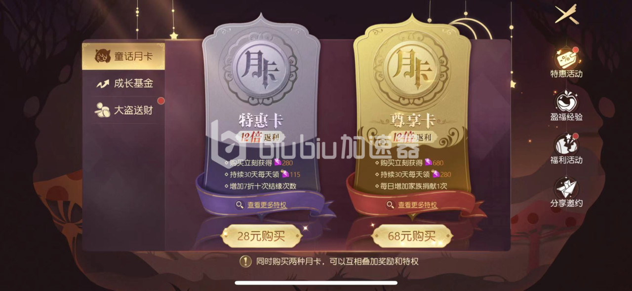 尊享卡可在福利界面特惠活动处购买,还是性价比比较高的,不仅仅可以实现制定交易功能,还有额外钻石和绑定钻石可以获得,还可以给结缘次数进行打折,增加爵位津贴,增加额外竞技场次数等等,活动多多福利多多,有条件的玩家可以充值一下,不是很贵。