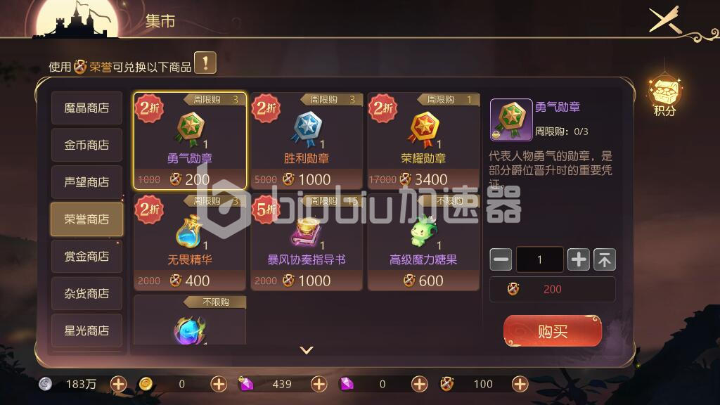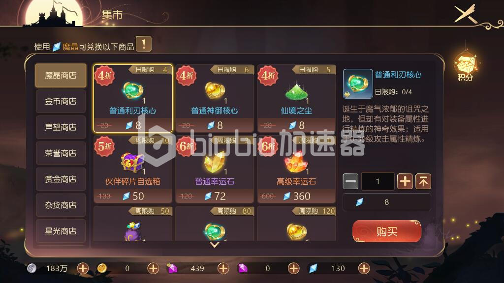 首先,游戏当中的玩家们是可以通过集市这一功能来完成交易的。大家进入到集市之中,就可以看到大量不同类型的商店。有些商店需要消耗魔晶来兑换道具,而有些商店则需要金币、声望、荣誉等点数来兑换道具。