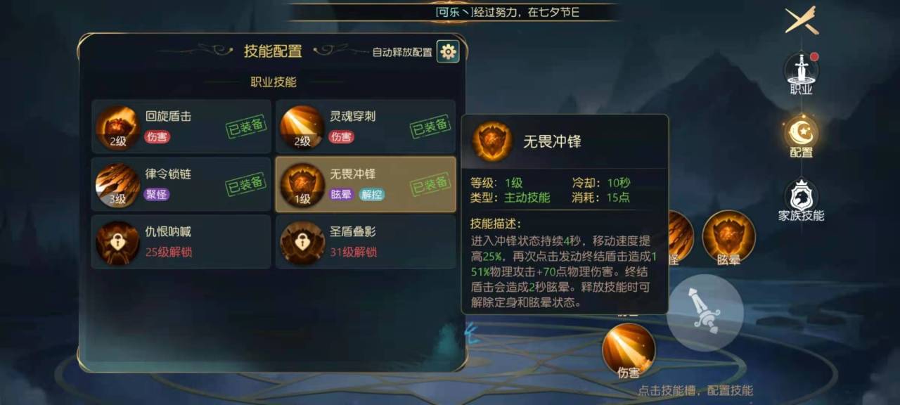 如果是裁决骑士的话,那么无畏惧死冲锋,圣盾叠影,裁决天使和狂热打击就是必须先加满的技能了,无畏冲锋是骑士很好的进攻技能,能够拉近和远程的距离。圣盾叠影可以降低目标的防御力,狂热打击是朝着前方的目标疯狂输出的技能。最后的裁决天使是一个类似于吸血的技能。