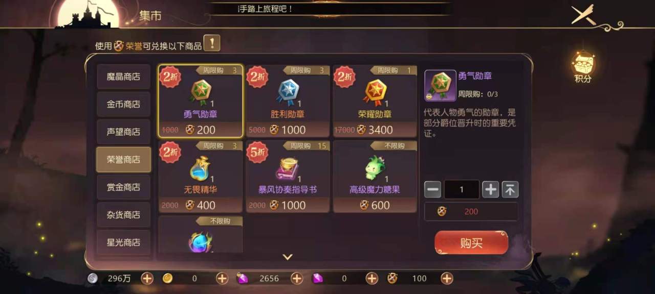 勇气勋章在荣誉商店中的售价是1000点荣誉一个,不过现在都有打折的优惠,尤其是在一些老区中,打折的力度是很大的,甚至仅需要200点荣誉就能购买一个勇气勋章,但是购买的数量有限制的,每一周只能购买三枚勇气勋章,所以需要大家在每个周的第一件事就是先把勋章买下来,即使当前不同也可以先屯着。