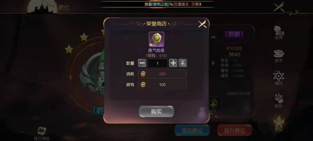 勇气勋章是前期伯爵之前的爵位晋升必须的道具,除了需要角色评分达到要求之外,还有有足够的勇气勋章才可以。勇气勋章最主要的获取方式就是在荣誉商店中购买,荣誉商店是为竞技场和斗技场而准备的专门的商店,其中的道具都是需要使用荣誉来购买的。