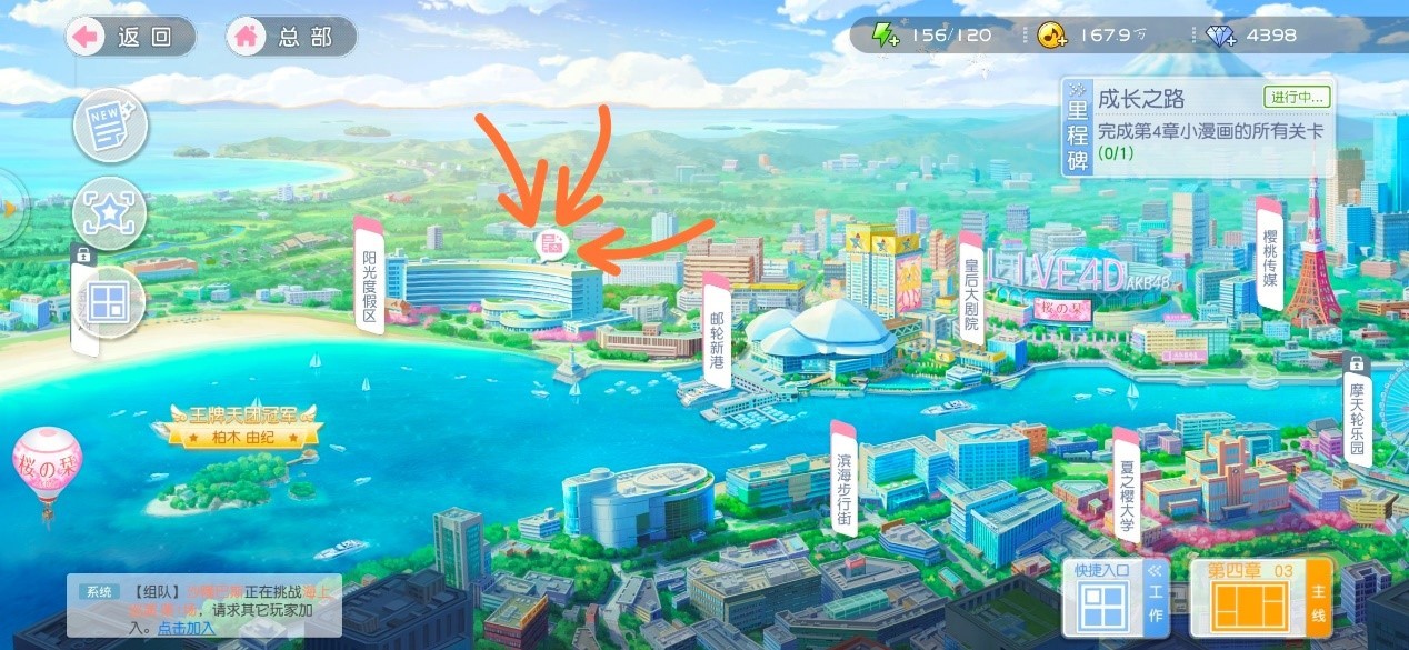 大家在"外出"的地图上,去寻找下图中与箭头所指的图标相同的图标,找到与该图标靠得最近的地点,例如图中的图标,离它最近的地点是"阳光度假区",然后大家点击"阳光度假区",进入该地点。