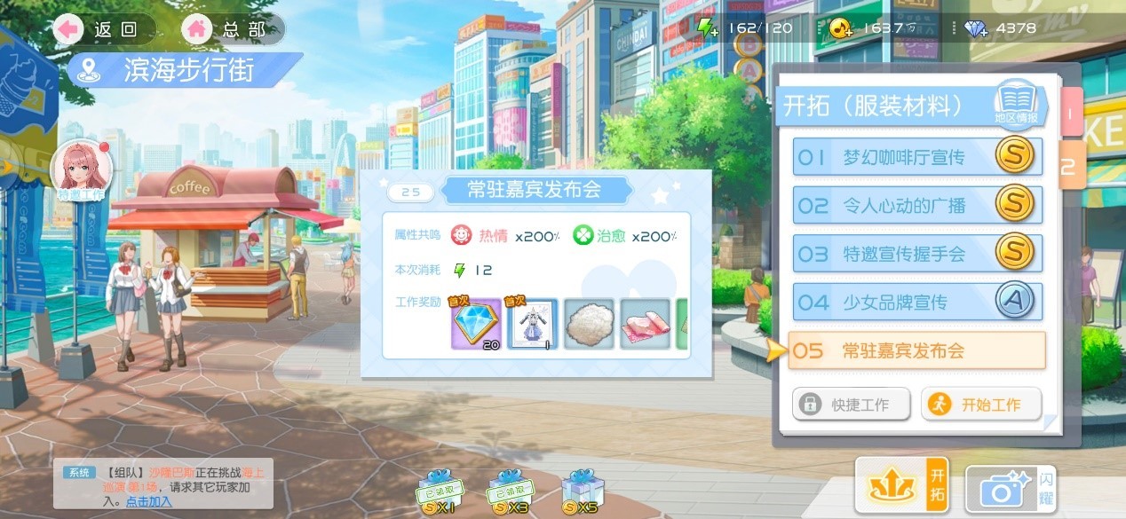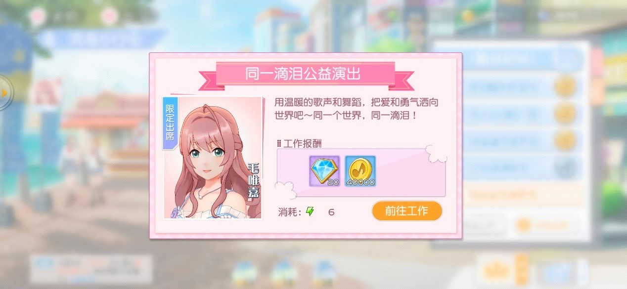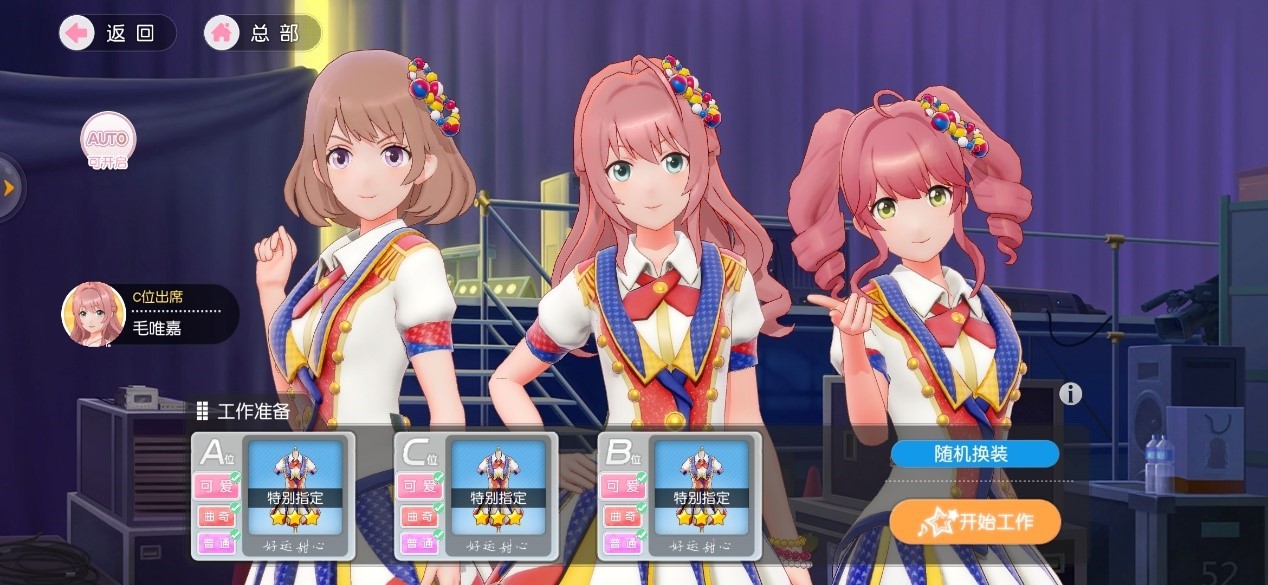 下一步就是正式任务的阶段,首先会进行偶像站位的调整,偶像站位的c位一般是此次特邀任务工作的限定出席偶像,然后选择合适的服装,点击"开始工作"进入工作