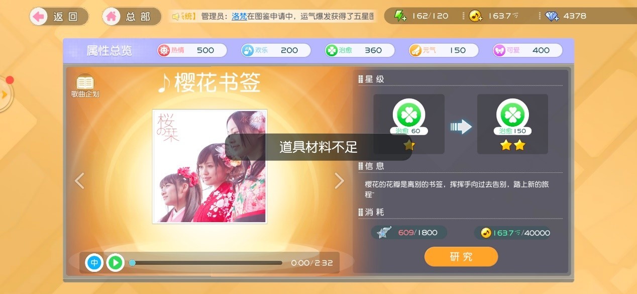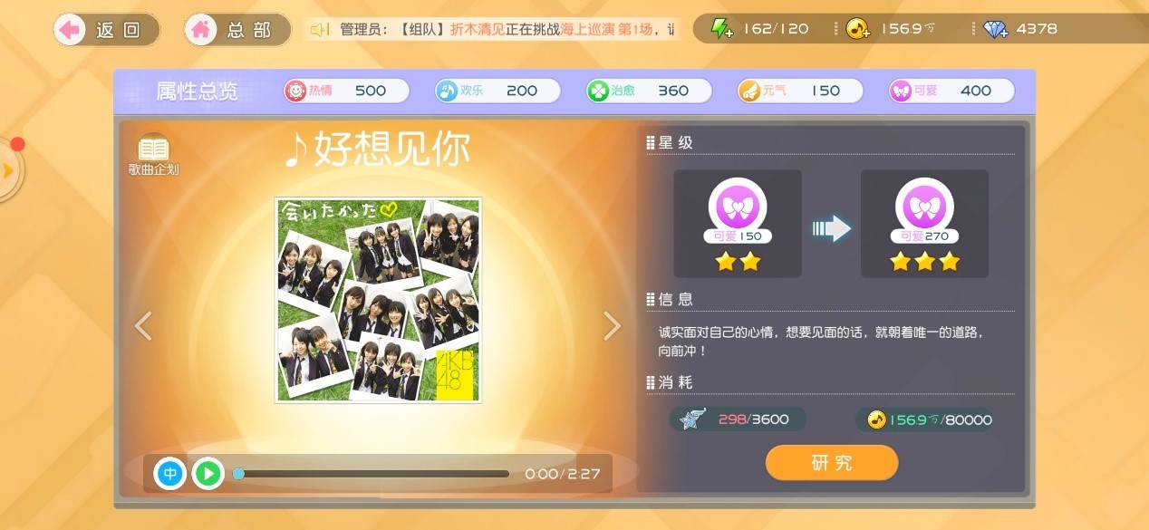 当我们拥有足够的银星徽章时,点击消耗栏目下方的"研究"按钮,就会看到该歌曲升星成功了。