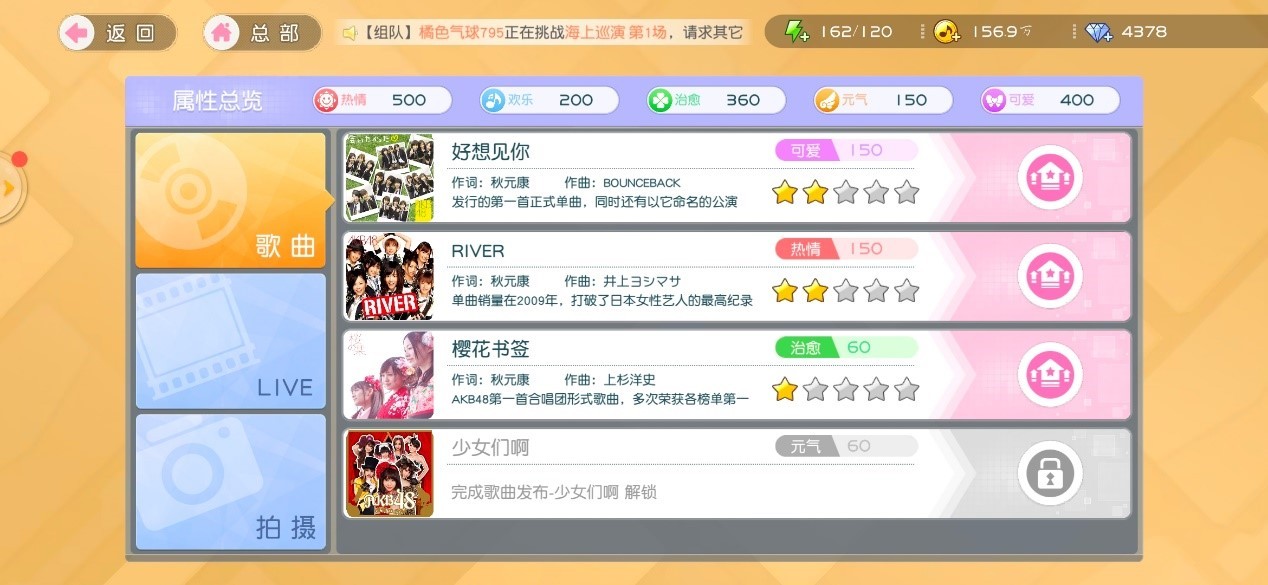 歌曲的初始星级是一星,需要不断的升级歌曲星级,更高的星级在之后的演出活动中可以赚取更高的报酬。