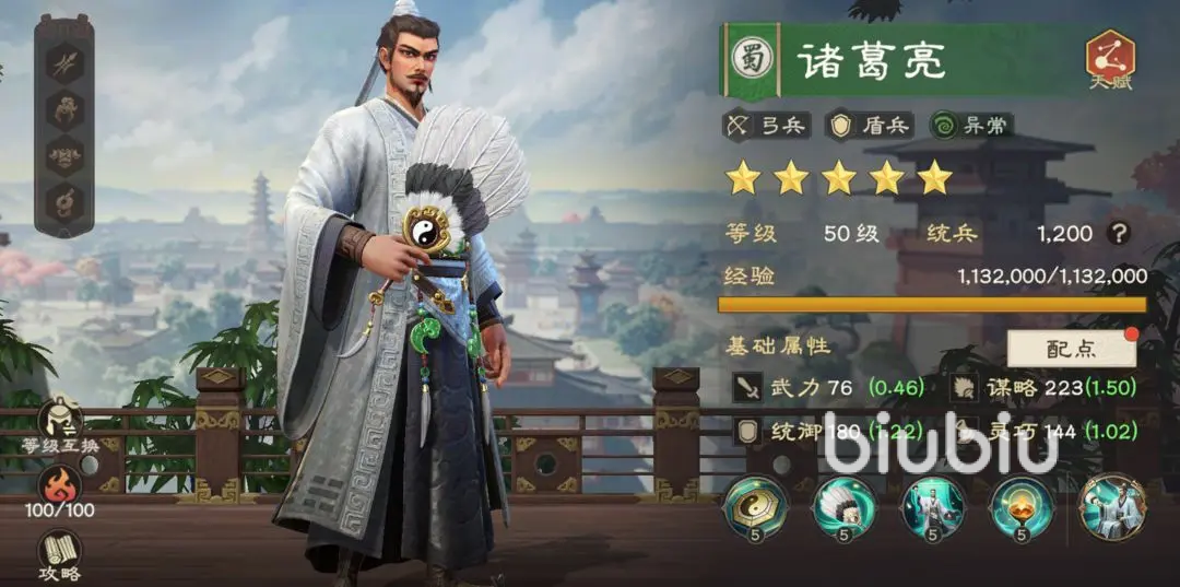 还拥有好几种被动效果,麾师北伐能提高盾兵弓兵攻击力,增强输出效率;神机妙算能让主动技可目标挂5秒灼烧buff;鞠躬尽瘁是核心被动,能让队伍额外异常伤害提高,普攻还有概率施加治疗。觉醒后普攻有可能获得闪避,打团战的时候有着非常不错的收益。主动技亮点在通过灼烧,治疗进行持久战,有效降低战斗的损耗。