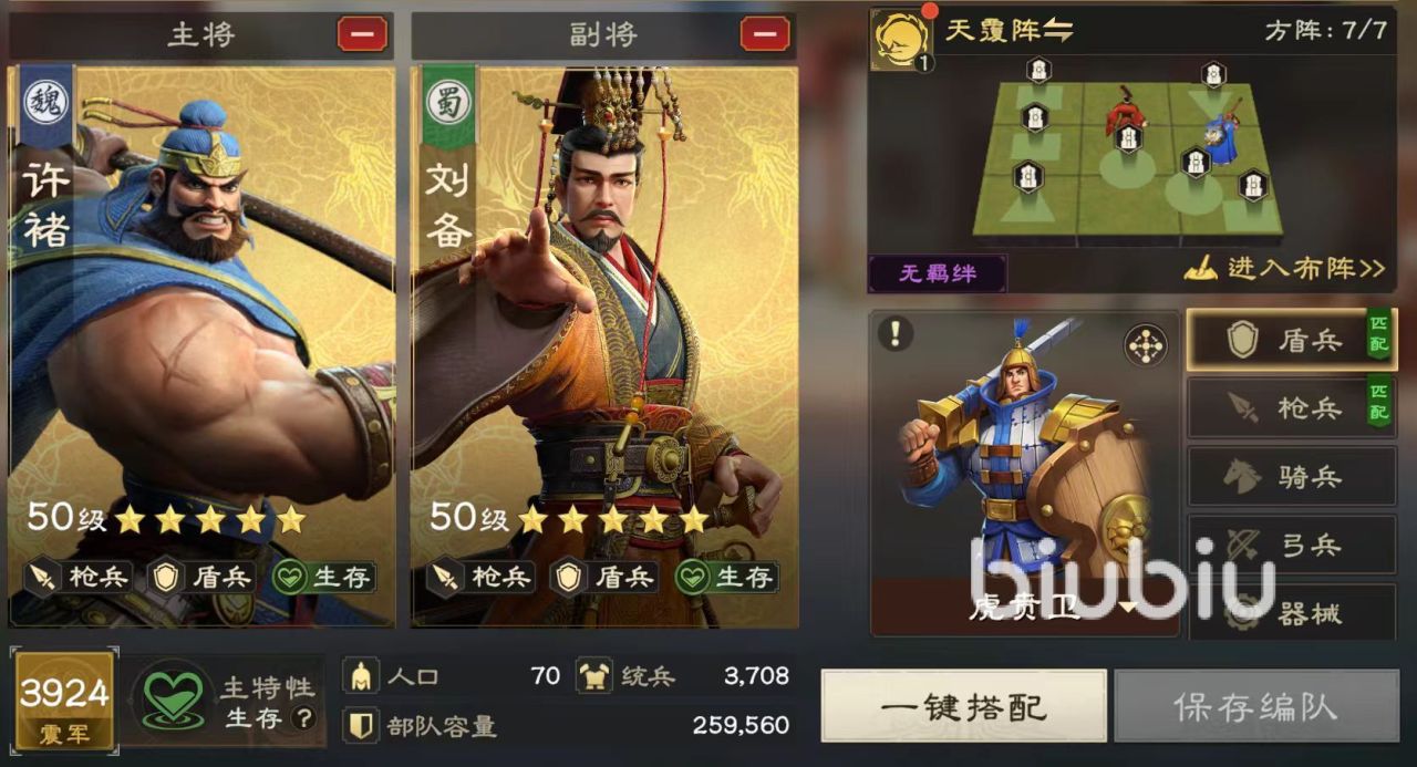 结合上面所说的特殊兵种和游戏中的武将,如果想要玩盾兵队伍,有以下几种搭配方式。首先是生存盾,选择的主将是许褚,副将是刘备,配备的兵种是虎贲卫,选择阵法为天覆阵。这是第一赛季最推荐的盾兵组合方式,许褚技能可提升抗性加成,刘备也具有相似的效果,降低队伍的普攻暴击、技能暴击所产生的伤害,使得整支队伍的抗性非常高,可有效牵制对方打造的普攻和技能体系队伍。