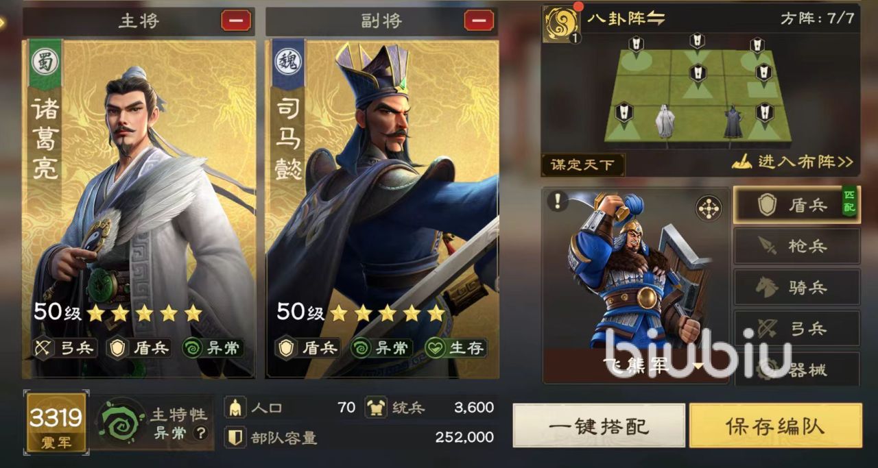 还可以选择异常盾,例如诸葛亮和司马懿一起组成智谋异常盾,选择兵种是飞熊军。这一套搭配选择的武将能激活羁绊,效果是提升造成的异常伤害,阵法选择八卦阵或者是鱼鳞阵。这是目前的顶级异常队伍,司马懿的普攻能附加中毒效果,在释放技能时,诸葛亮被动有几率给目标附加灼烧。这两名武将的谋略成长都很高,通过异常状态能够打出高额伤害。这两个武将都具有额外的续航能力,只要战力相差不大,基本不怕任何阵容。