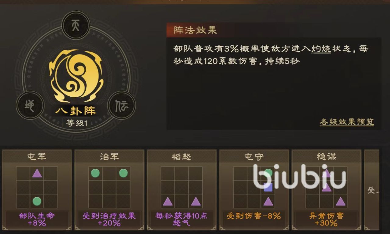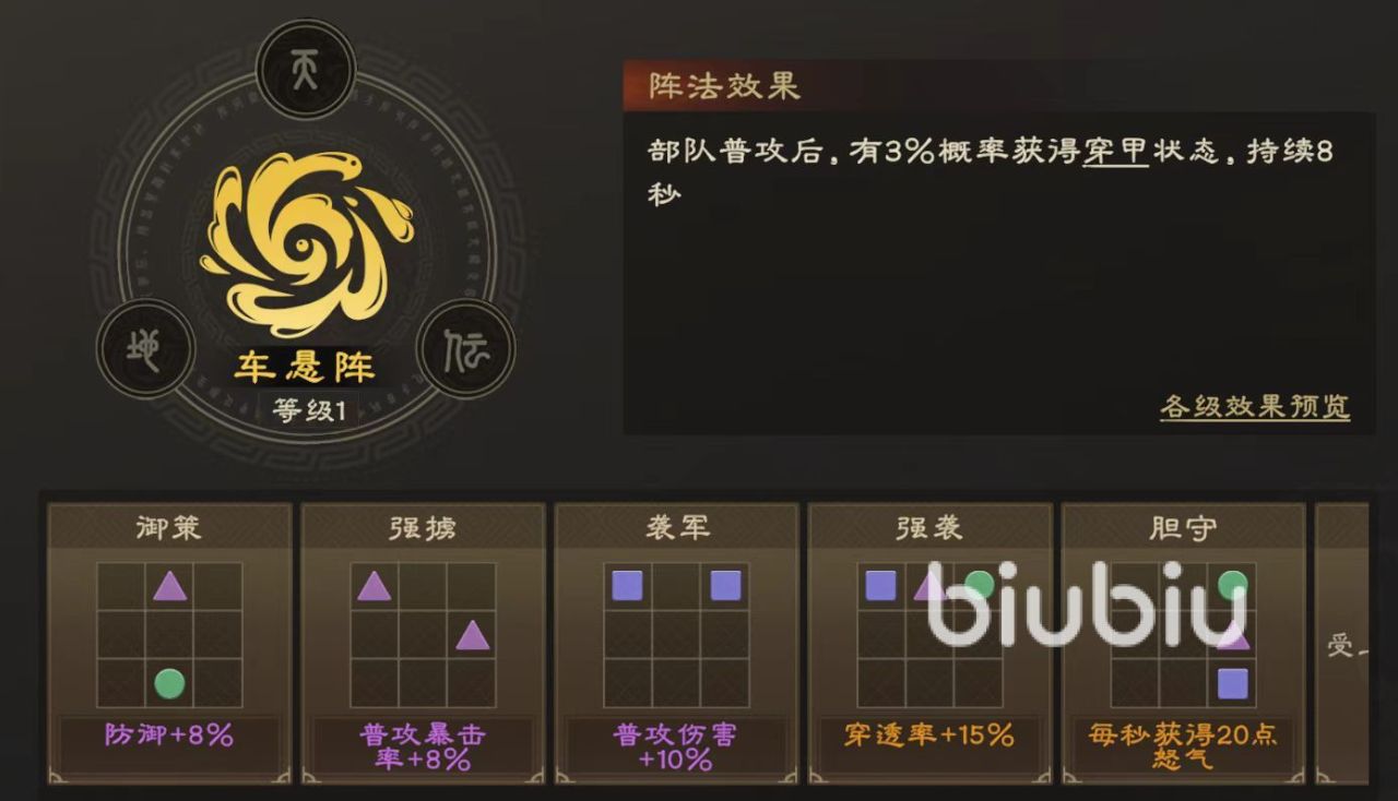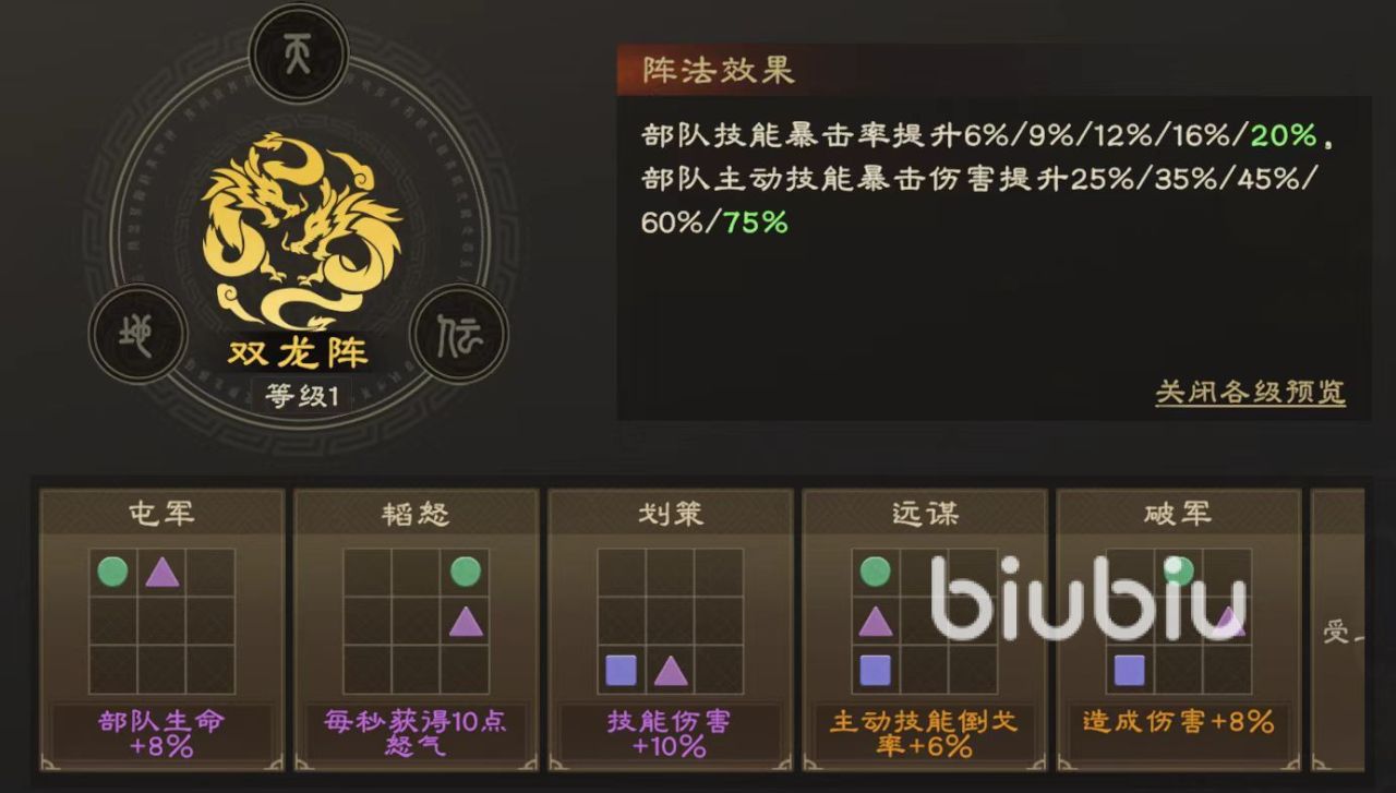 首先是技能类型的阵法,主要包括七星阵和双龙阵,七星阵在队伍普攻后有几率提升主动技能伤害加成,双龙阵提供的是部队技能的暴击率,主动技能暴击伤害等。这两个阵法中,双龙镇更适合走暴击和爆伤路线的队伍选择。七星阵暴击上限高,技能增伤等方面更为稳定,这两个都适合于技能体系,小编的建议是哪个等级高就用哪一个。