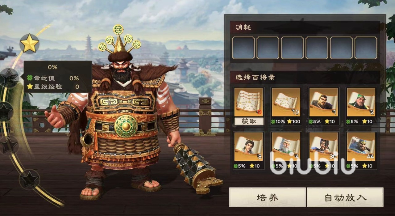 接下来是星级和技能,武将需要达到一定的星级和等级之后,才能解锁更多的技能,所以提升星级和技能等级,也是想很重要的,是拉开差距的重要部分。武将升星需要消耗对应品质的百将录,在星级经验满值之后,可升到下一星级。这里还有一个幸运值的属性,代表双倍经验转化的概率。这里有一个小技巧,就是叠高幸运值,一次性选择更高经验的百将录,一旦触发双倍,就可以获得更高的星级经验。技能升级需要消耗对应的百将谱,百家谱资源比较有限,所以要确定好的优先级。在所有技能都达到满级之后能获得觉醒技能,觉醒可大幅度提升武将强度。满技能升级需要消耗的百家谱非常多,从前期就要注意积累。