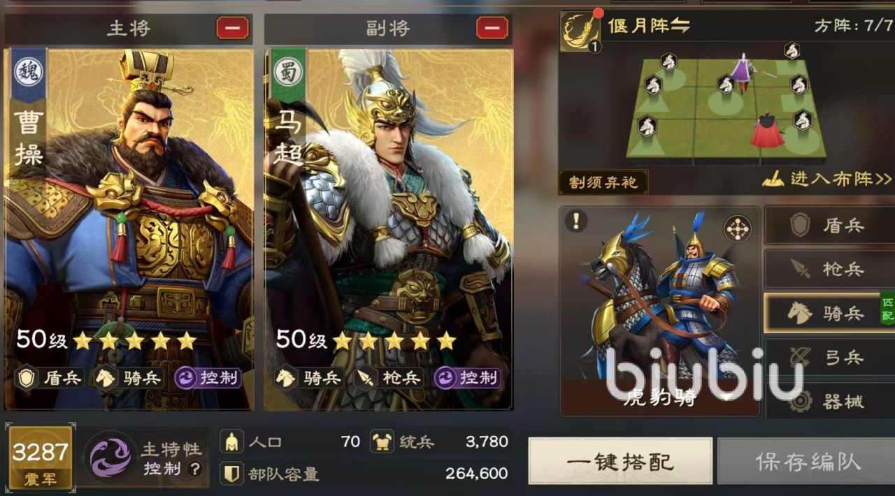 先来看一下控制骑这个体系,在持久作战的情况下能够发挥出优势,通过限制对方的普攻和技能,来降低队伍的损失,己方部队则可以源源不断的输出伤害。小编推荐大家选择曹操和马超的组合,这二人可以激活割须弃袍羁绊,提升统兵上限,兵种选择搭配虎豹骑,延长控制时间。马超能通过自身技能所带的沉默、降怒等特点限制对方的输出,曹操则是提供缴械、技能状态附加,通过控制状态等不断衔接,降低对方输出,逐步压低对方兵力。但是需要有较高的技能等级,只有控制技能等级提升之后,才能提升触发几率,提供稳定的控制。