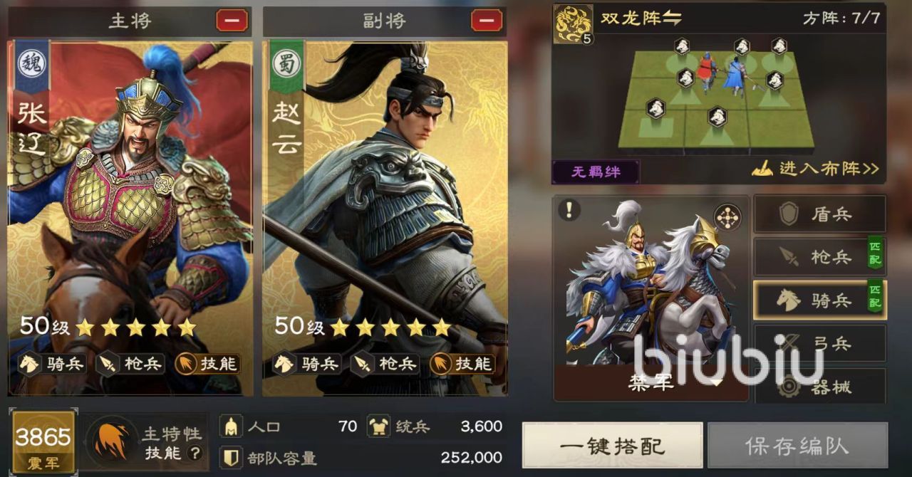 技能骑主打的是单挑和小规模作战,利用伤害快速削弱对方兵力,推荐大家选择张辽和赵云的组合方式,兵种搭配禁军,提供击飞和暴击率加成。张辽在催坚破盾技能升到满级时,可以大幅度提升整个队伍的怒气恢复效率,赵云也能提供回怒属性,所以这二人的组合能够有更高的技能使用频率,在此基础上再加上技能系数高,暴击率高等优势,做到暴力输出。