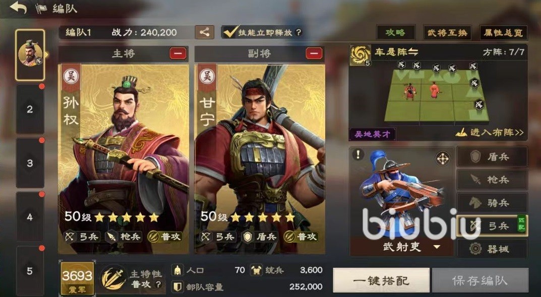 除了甘宁输出之外,太史慈也可以利用自身的怒气技能对前方敌人造成大量伤害,且附带吸附效果,快速将周围的敌人聚集过来。太史慈的被动效果能增强暴击率和暴击伤害,这样这支队伍在攻击时可以更高频率地触发暴击。这样一支队伍拥有很强的持续输出能力。除此之外,大家也可以选择孙权搭配甘宁的方式,兵种和阵法依然是按照上一套阵容去选择。这一套队伍爆发力更高,因为孙权的输出非常强劲,甘宁提供额外的容错和多频率输出,能快速削弱对方兵力,降低己方损耗。