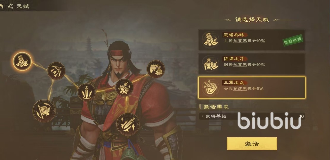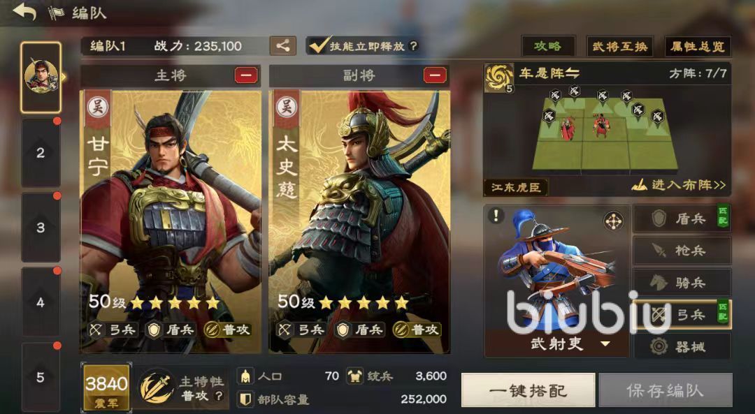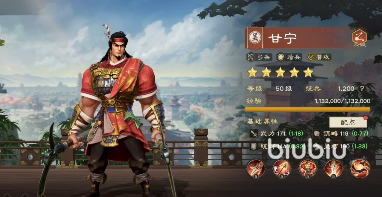 甘宁主要依赖的是自身的被动技能打伤害,被动可以大幅度强化部队防御,在输出方面能提升暴击和攻击伤害加成,虽然爆发不如一些技能型武将,但胜在能持续作战,搭配其他普攻流武将可以打出更高的损伤。在搭配阵容的时候,小编比较推荐走虎臣弓的路线,就是甘宁加太史慈,这二人能够触发羁绊,普攻暴击率提升,兵种选择武射吏,进一步增加暴击率,推荐阵法选择车悬阵,车悬阵的优势在于部队普攻之后能进入到穿甲状态,免疫反击伤害提升自身的续航。