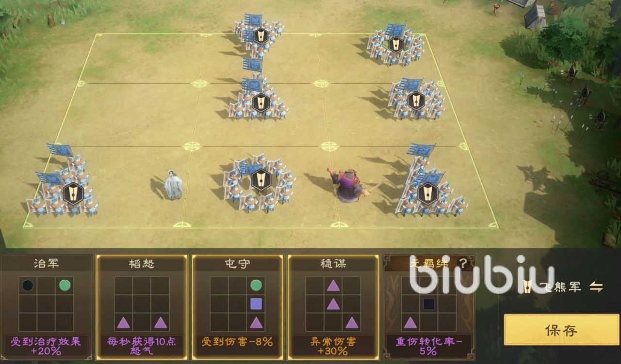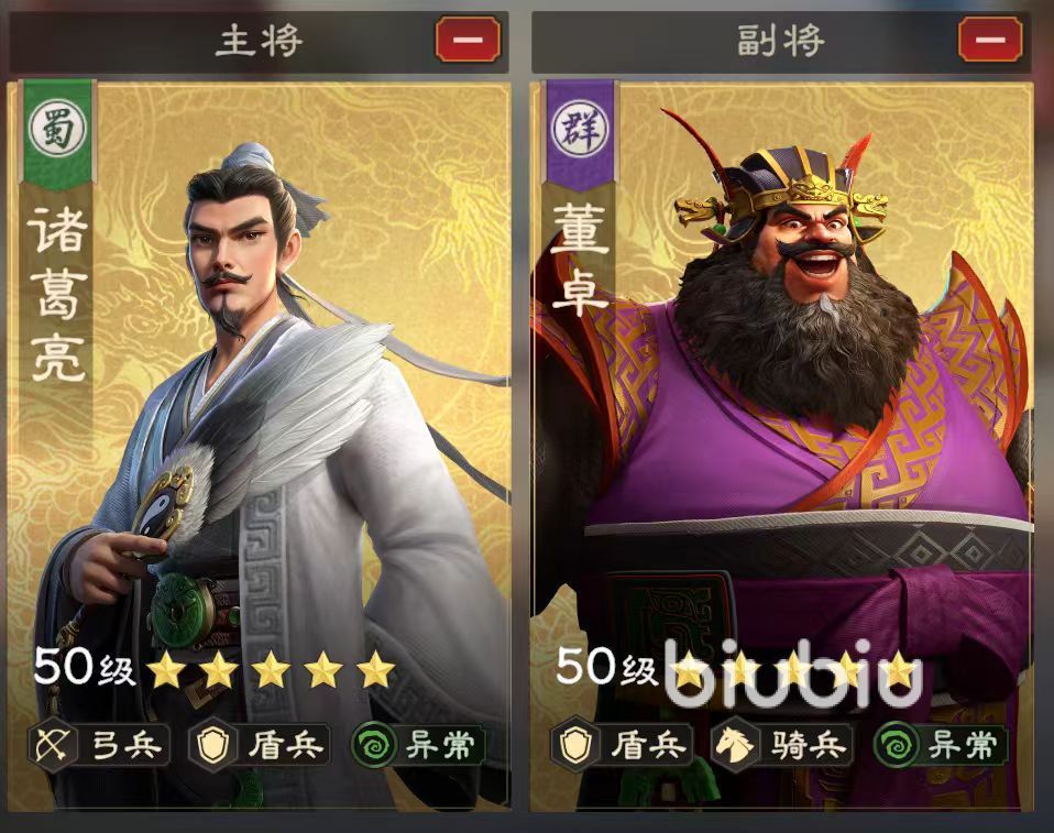 在阵容搭配方面,小编最推荐的是走异常盾的路线,选择诸葛亮作为主将,董卓作为副将,兵种选飞熊军,阵法方面可以选八卦阵,也可以选鱼鳞阵。这两个武将的怒气技能,都具有控场效果,这样就能很好的限制敌方部队攻击,起到一定的控场作用。董卓能够增加盾兵生命值,给目标挂上中毒效果,诸葛亮挂上灼烧,这样异常伤害叠加起来非常可观,这支队伍中有很强的持续作战能力。不过董卓对于练度有着较高要求,所以建议多投入一些资源。