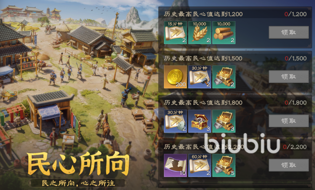 先来讲一下民心值的作用,可以影响征收铜币的数量(每次征收铜币=600+民心值*0.2)。历史最高民心值达到要求可领取对应奖励,历史最高民心值进行全服排名,可获得排行奖励(如称号、名帖背景)。要是大家想要正式获取民心值的话,那就需要在民生区域正确摆放和升级民生建筑,通过覆盖特定资源或建筑获得民心分数。
