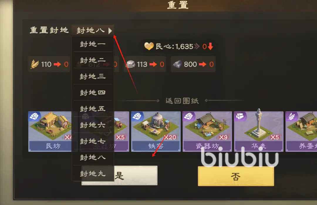 在这之前也需要建筑图纸才能够升级并获得资源,这时可以通过探索大地图获取,也能够选择完成封地剧情事件并击败强敌。也可以尝试使用铜币在民生府的图纸商肆购买(所有建筑无需氪金,只需图纸碎片兑换)。拥有图纸之后就要进行摆放了,这时需要遵循建筑之间的覆盖关系(如绿色图纸覆盖自然资源,蓝色图纸覆盖绿色建筑等)。