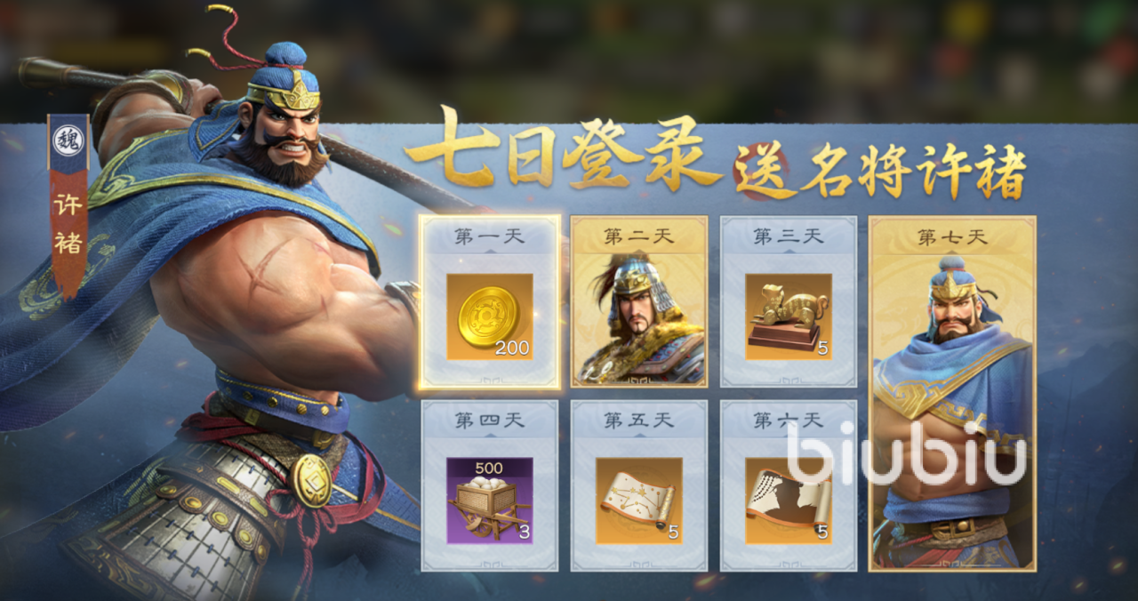首先推荐大家在公测时就登录就可以获得一个公测礼包,这里包含稀有橙将【孙策】、【许褚】及海量资源,不过要连续7天都完成登录才能够获得所有奖励。这些稀有橙色武将在前期可以为玩家们带来巨大的帮助以及提升,不过记得要搭配吴国等相关武将,才可以获得相关羁绊。