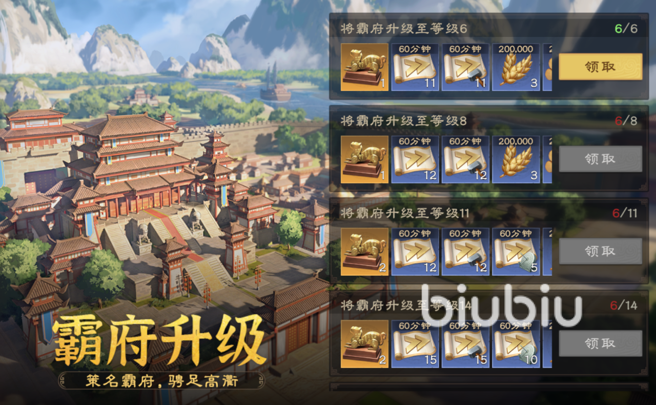 另外还有霸府升级奖励,根据霸府等级领取对应资源,也就是所谓的礼包,所以大家要争取每天都做完任务或者其他的活动,就可以快速提升霸府等级了。另外还有民生排名活动礼包,只要大家在排行榜中获取更高的名次之后,就可以开礼包并获得顶级称号【万景敬仰】、名帖背景【竹海云庐】等。