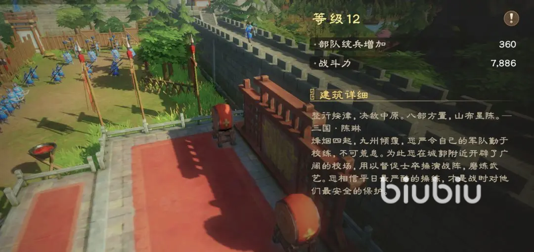 军事建筑比较多,也比较重要,兵营等级对单次训练部队容量有影响;医馆在战斗中有伤兵时能进行治疗,决定每日金疮药产量,治疗量;校场影响着部队统兵上限,时提升部队战斗力的核心所在;铁匠铺的用途是装备锻造,拥有更高级别,即可获得品质越高的装备。