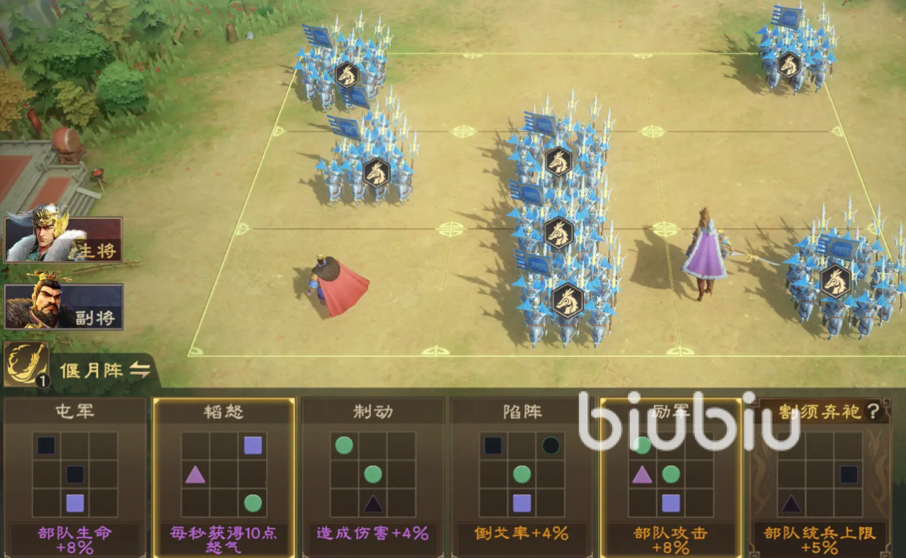 实战选择阵法如果用来针对技能队,建议去选择偃月阵,这样普攻能提供沉默,有较高的打击面覆盖,阵容推荐割须骑,也就是和马超组队,兵种选择虎豹骑来延长控制时间,该队伍能触发割须弃袍羁绊,提升统兵上限,从而提升队伍持续作战能力,这两人都带有降低敌人怒气效果,在加上沉默机制可以有限限制敌人的输出。