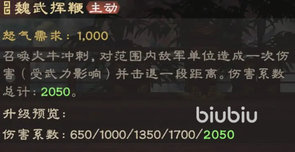 曹操的怒气技会召唤火牛展开冲刺,对沿途范围内的敌人造成伤害,并击退一段距离,此招伤害系数不算高,但可以牵制敌方的输出,他的被动“龙战于野”能在部队普通攻击后,有10%的概率缴械敌方的部队,持续4秒的时间。