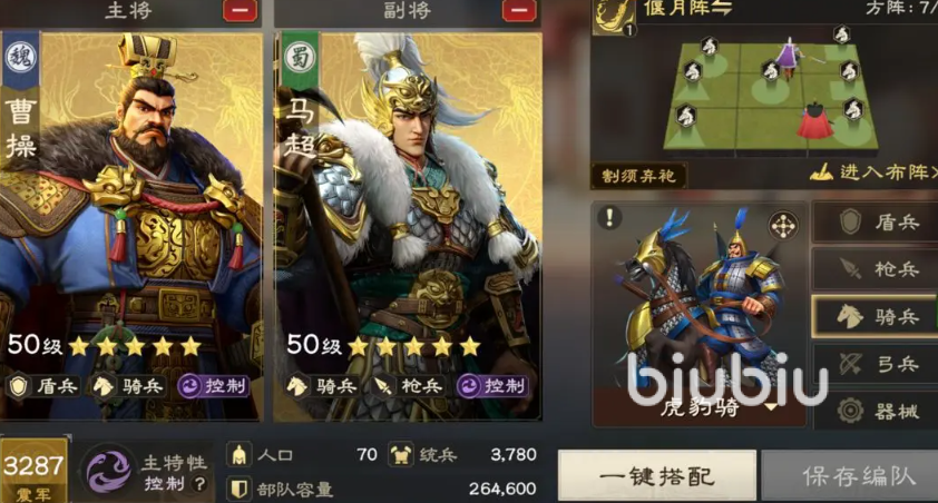 控制骑,包含割须骑和魏骑,是比较稳健的选择,优势在于通过控制技能来降低敌军的输出。割须骑由曹操和马超组成,依靠缴械、沉默、降怒等手段,可以有效限制技能队的爆发点,再结合虎豹骑延长控制时间的特性,就能形成极强的压制力。面对技能队时表现出色,挑战蛮族或持续作战的场景中,也能通过多控衔接有效降低战损。
