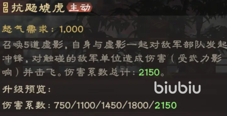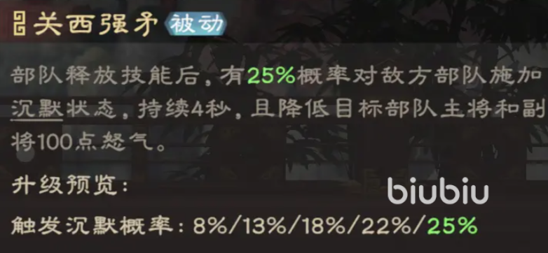 并且能直接降低目标部队主副将100点怒气,沉默加降怒能有效限制敌方主动技的使用,他的“威武并昭”能对处于控制状态下的提升造成的伤害,并且部队每次普攻都有几率获取到坚韧,坚韧能使得部队不受到反震,一定程度伤降低战损。