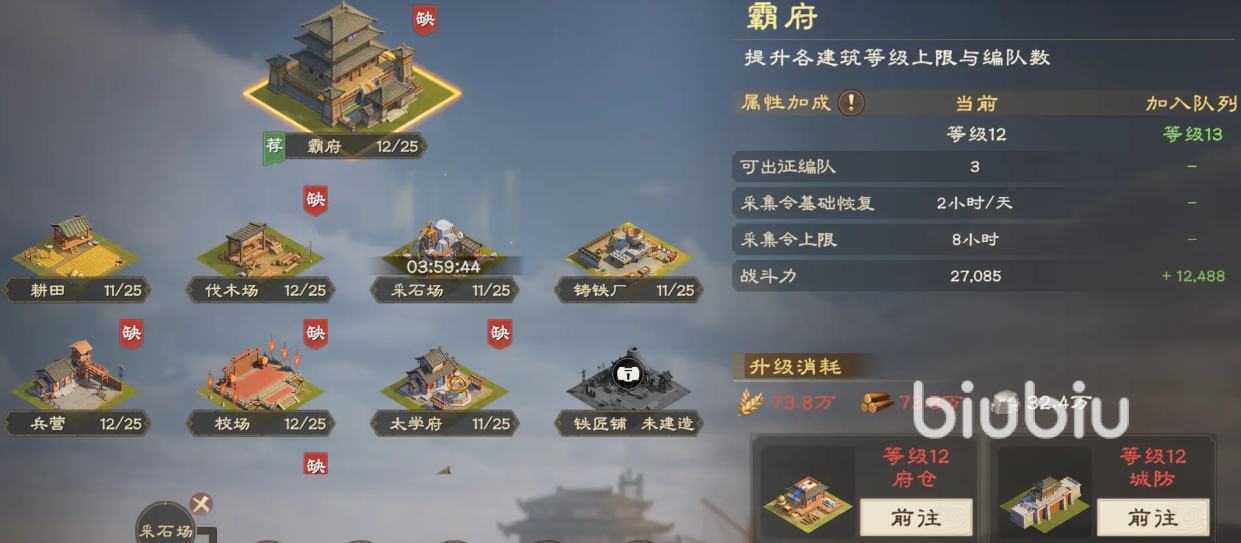 建筑升级应以主线章节为准,每个建筑升级都可能有前置条件,例如升级霸府至12级,需要府仓和城防等级达到相应要求。建筑升级消耗资源和时间,但初期活动通常提供大量加速道具,可在开荒前三天充分利用,加快进度。除了加速道具,任务和活动也会提供丰富资源,用于建筑升级和扩张。与此同时,战力提升同样离不开城建支撑。校场直接影响部队容量,是提高队伍战力的关键,太学府则负责科技研究,解锁二级兵、三级兵乃至更高级别的兵种,这些都会显著提升战斗力。资源获取方面,耕田、伐木场、采石场和铸币厂四大基础资源建筑是主要来源,跟随主线逐步提升等级即可。同时,通过采集令可提升采集速度,初期尤其注意石矿资源的补充,根据缺口合理分配。